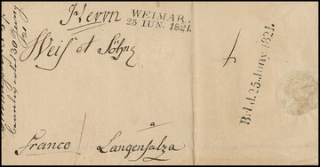 "Weimar", 1821, vs. L2, rückseitig sehr seltener Briefsammlungs-L1 der Brieflade, "Brl. d. 25. Juny 1821", auf Faltbrief aus dem Weimarer Landbezirk nach Langensalza