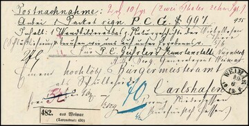 "Weimar", 1861 ff., K1 1861 und 1866 auf zwei Paketbegleitbriefen, letzterer mit Nachnahme. Einmaliges Paar, beide mit Paketzetteln mit Register-Nr. "482", jedoch einmal in kleiner und einmal in großer Typographie