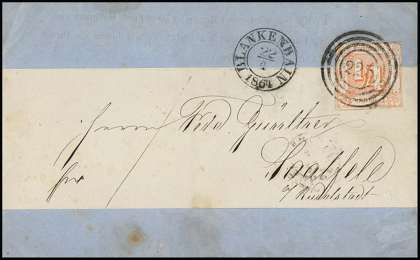 1/4 Sgr. rotorange, ausgabetypisch geschnittenes Prachtstück (nur rechts oben winzig berührt) einzeln auf vollständiger Drucksache, Schleife mit Inhalt (geringe Patina) mit NS "225" und K2 "Blankenhain" 1864, Fotoexp. Sem