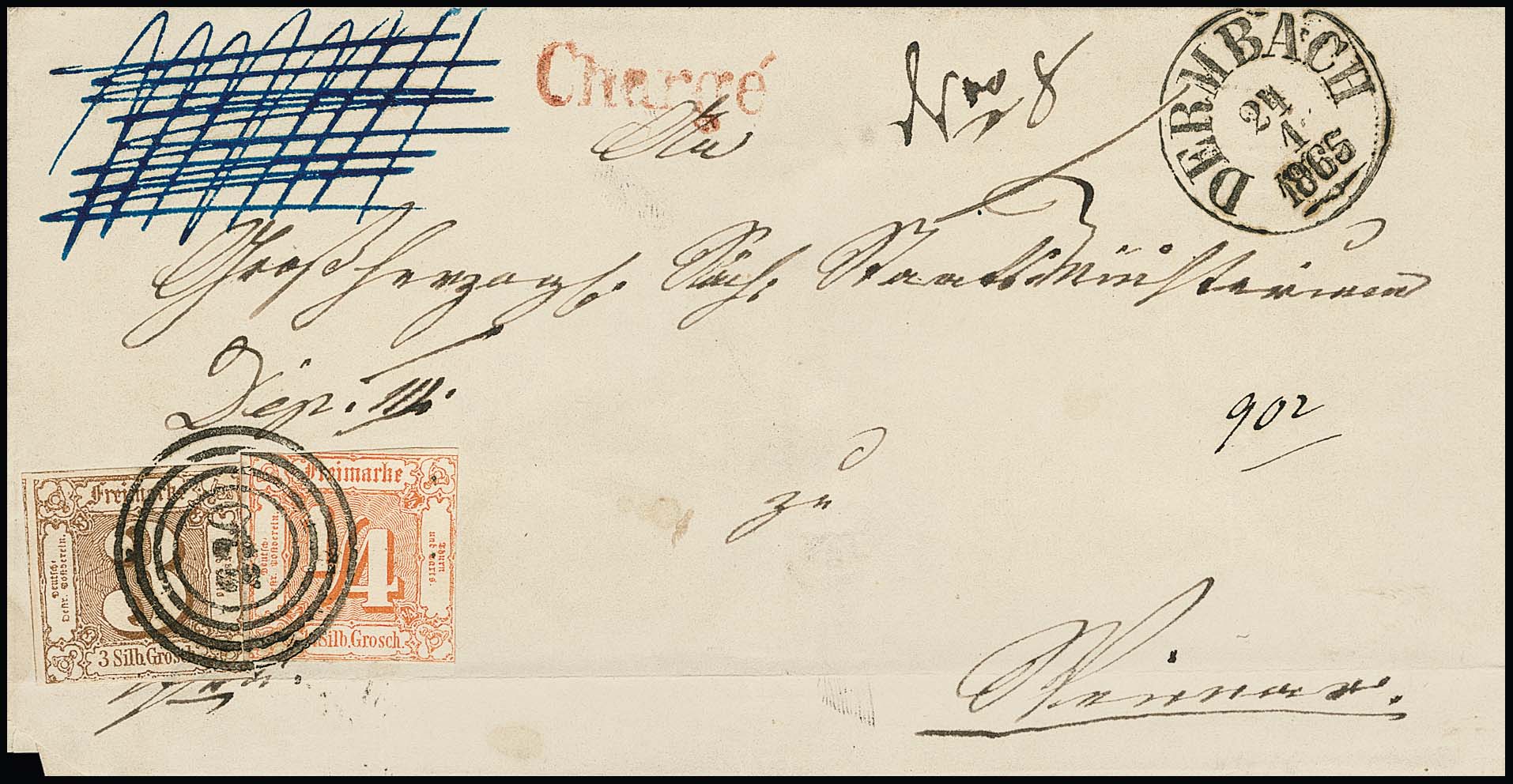 1/4 Sgr. rotorange, weitgehend vollrandig, in Mischfrankatur mit riesenrandigem Luxusstück 3 Sgr. ockerbraun auf dekorativem Chargé-Brief (links unten unbed. schräge Ecke und Faltspur ausserhalb) von Dermbach (NS "230" und K1) nach Weimar, 1/4 Sgr. Bestellgeld, 1 Sgr. Porto, 2 Sgr. Reco