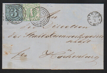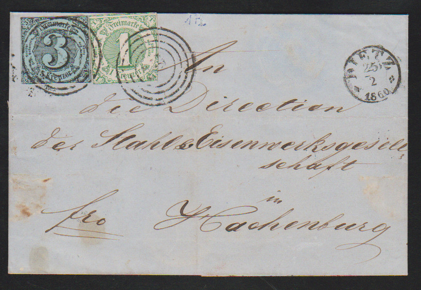 3 Kr. schw./graublau in Mischfrankatur mit Ausgabe 1859, 1 Kr. grün, auf Brief mit NS "172" und K1 "Dietz", Taxisschnitt