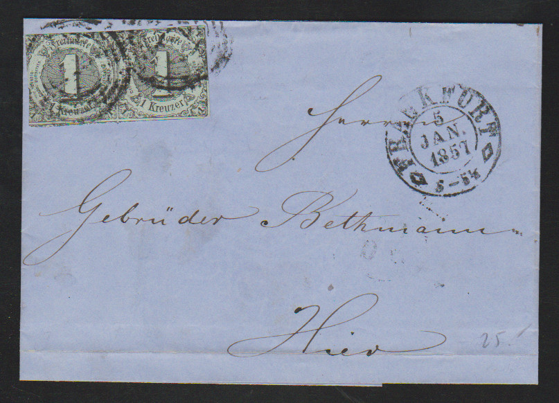 1 Kr. schw./bläulichgrün im Paar (links Schnittfehler) auf Ortsbrief aus Frankfurt 1857