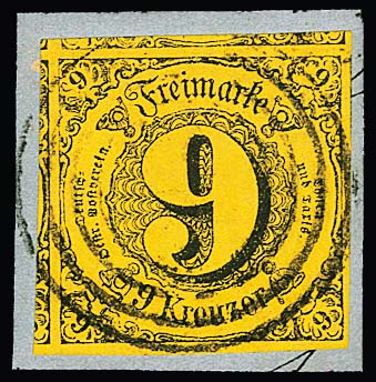 9 Kr. schw./gelb, ungewöhnlich riesenrandig, drei Seiten Nebenmarken, auf Kabinettbriefstück, ex Slg. Erivan Haub