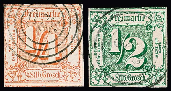 1/4 Sgr. orangerot (NS "326", drei Seiten Nebenmarken, sign. Pfenninger), sowie 1/2 Sgr. grün (NS "292", zwei Seiten Nebenmarken, sign. Bolaffi), zwei riesenrandige Luxusstücke,ex Slg. Erivan Haub