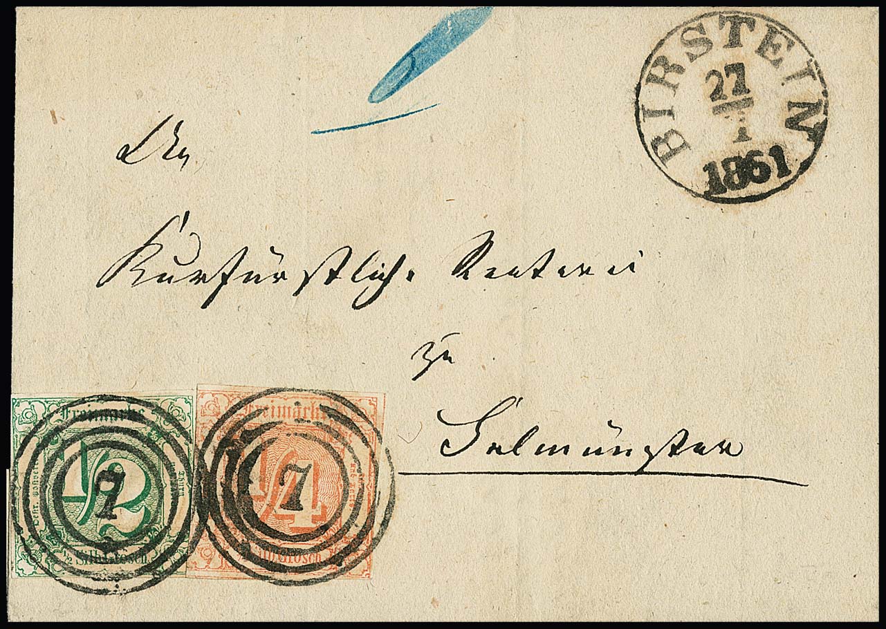 1/4 Sgr. rotorange und 1/2 Sgr. grün, letztere vollrandig, auf dekorativem kl. Kabinettbrief mit idealen NS "7" und K1 "Birstein"