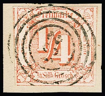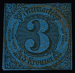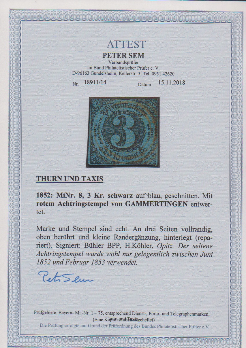 3 Kr. schw./blau (oben kleine Randergänzung) mit sehr seltenem rotem Achtringstempel von Gammertingen zentrisch. Sign. Bühler, Köhler, Opitz und Attest Sem (Mi. + 2500,-), ex Slg. Erivan Haub