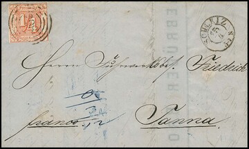 1/4 Sgr. rotorange, guter Taxisschnitt, einzeln auf Faltbrief mit NS "298" und K2 "Schleiz" nach Tanna, gemäß Postgenerale 1861 zum ermäßigten Sonderporto, der Empfänger mußte noch "3/12" (= 1/4) Sgr. Bestellgeld bezahlen