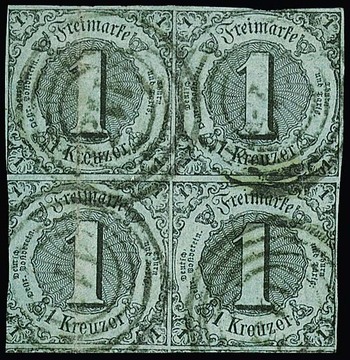 1 Kr. schw./bläulichgrün, von dieser Nuance seltener gestempelter Viererblock (linkes Paar Bug geglättet)