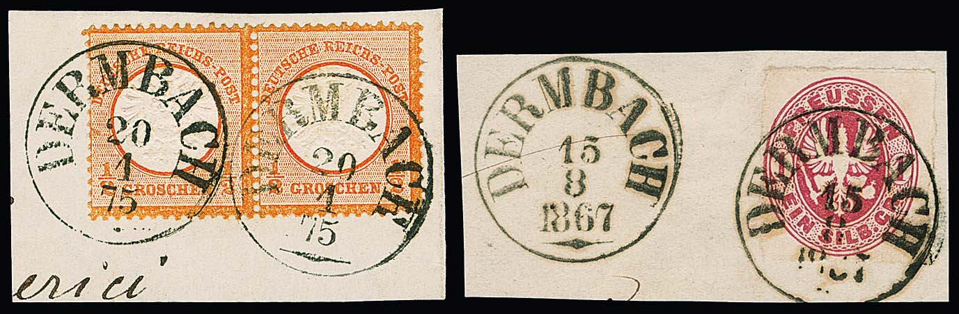 "Dermbach", klarer nachverwendeter K1 auf drei Briefstücken, 1 Sgr. Preußen, NDP 1/2 Gr. per zwei, sowie Paar 1/2 Gr. Brustschild (aus 1875)