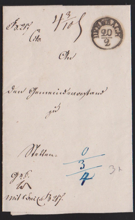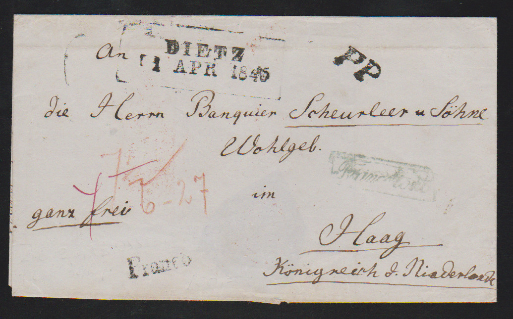 "Dietz", 1845, kräftiger L2 (optisch wie Ra2) nebst "PP" und "Franco" auf seltenem, voll bezahltem Auslandsbrief in die Niederlande