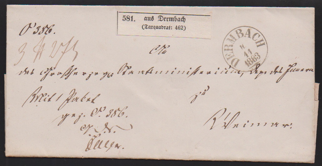 "Dermbach", vorphil. K1 auf Recobrief 1844 und auf portofreiem Paketbegleitbrief, ferner L1 auf Brief 1837, sowie K1 auf Paketbegleitbrief