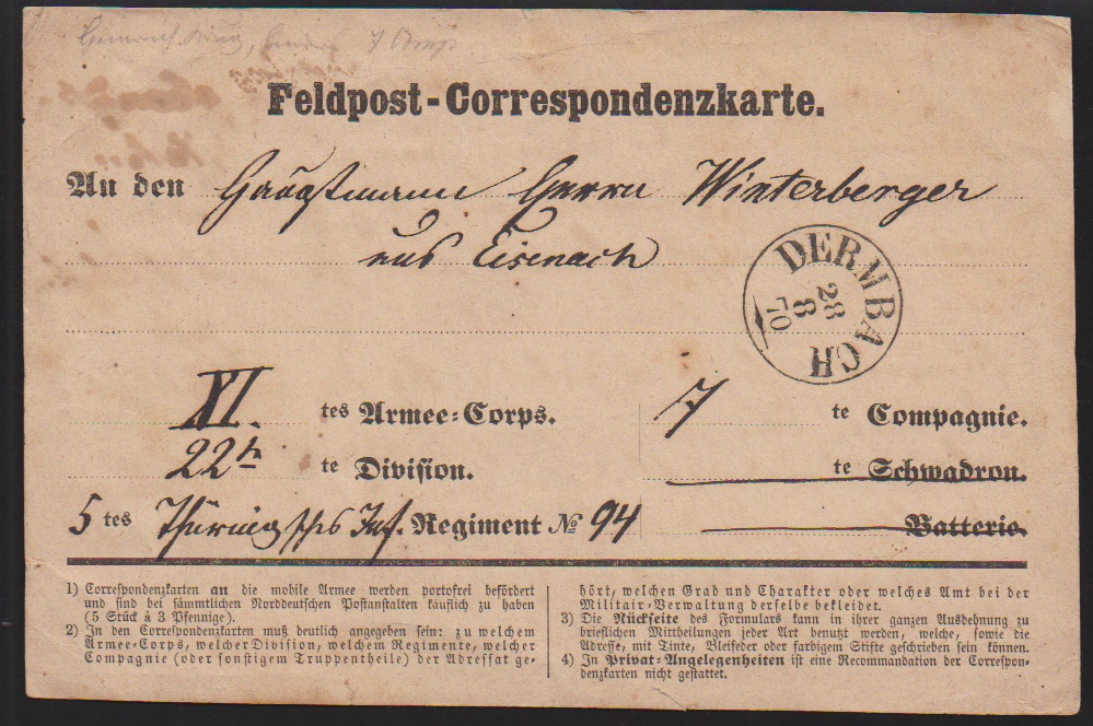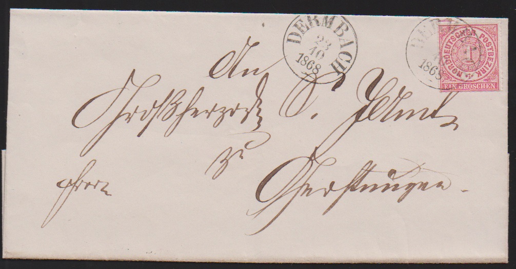 "Dermbach", nachverw. K1 mit voller Jahreszahl "1868" auf Kabinettbrief NDP 1 Gr., sowie teilaptiert ("70") auf üblich erhaltener Feldpost-Correspondenzkarte aus den ersten Tagen der Mobilisierung, 28.8.70