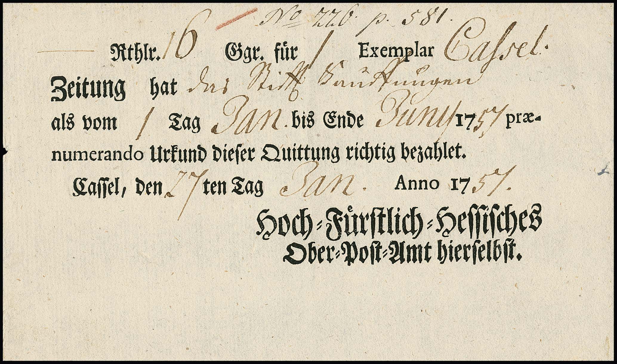 "Cassel", 1757, "hoch-Fürstlich-hessisches Ober-Post-Amt hieselbst", sowie 1777 "Fürstl. hessische Ober-Post-Amts-Zeitungs-Expedition hieselbst", zwei frühe Post-Zeitungsscheine, ex Slg. Erivan Haub