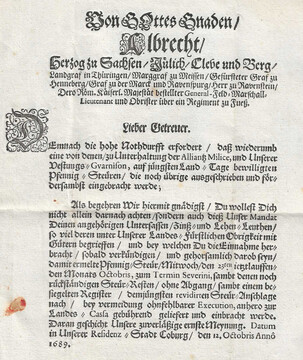 "Coburg", 1688-1690 (Pfälzischer Erbfolgekrieg), vier Briefe je mit Vordruck (zwei von der Ehrenburg) und Briefkopf "Von Gottes Gnaden Albrecht Herzog zu Sachsen ... General-Feld-Marschall ..."
