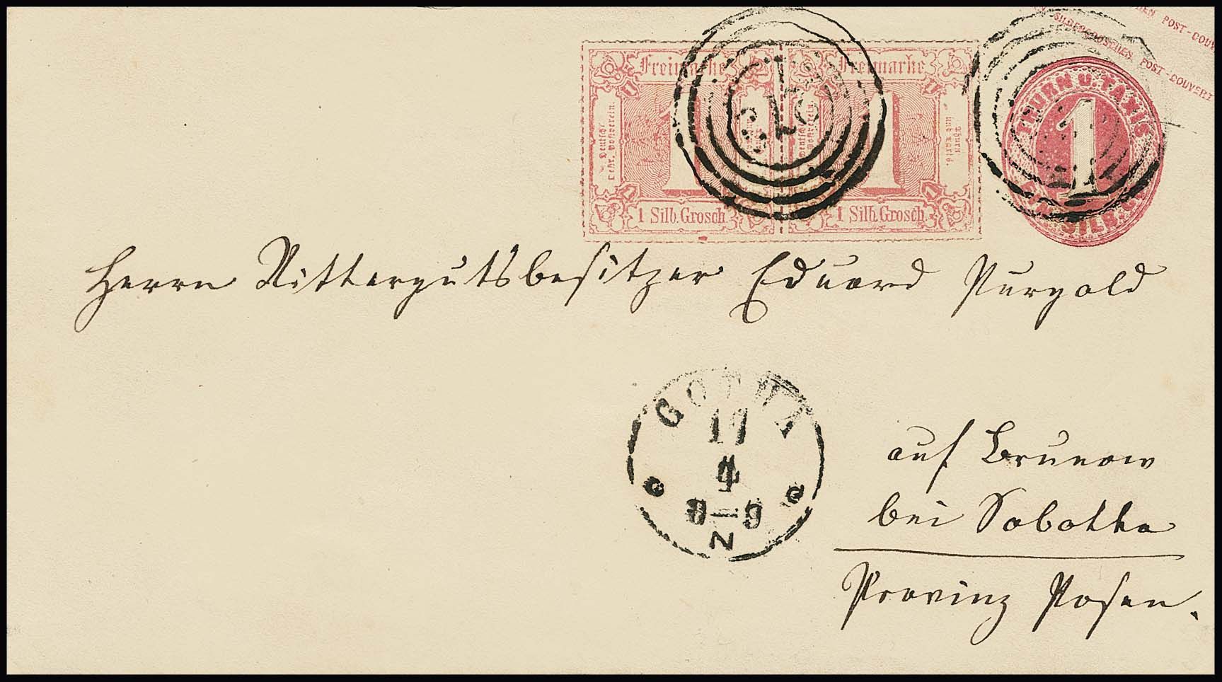 1 Sgr. rosa, Kabinettpaar (bei der rechten Marke Stempelringe im Übergang nachgezogen), linke Marke unten mit Druckbesonderheit "Randspieß", auf Ganzsache 1 Sgr. rosa, mit NS "273" und K1 "Gotha" in den Postverein nach Posen, Mi. nur der Nr. 48 schon 300,-, Fotoexp. Sem