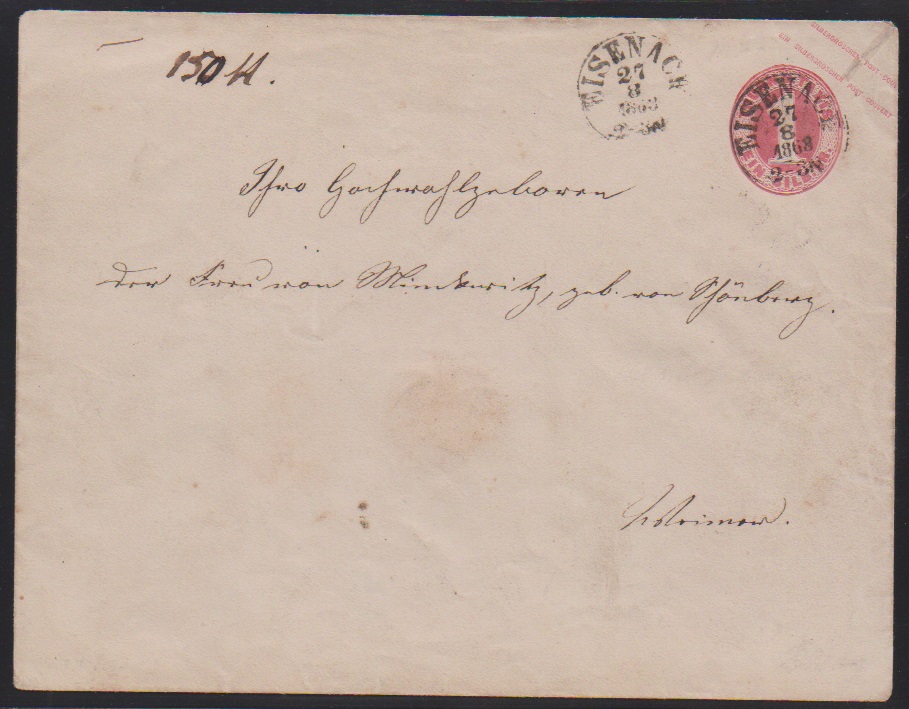 Ganzsache 1 Sgr. rosa im seltenen Großformat in ungefalteter, frischer Erhaltung (ganz min. Eckeinriß) mit K1 "Eisenach" 1863 nach Weimar, Mi. 220,-