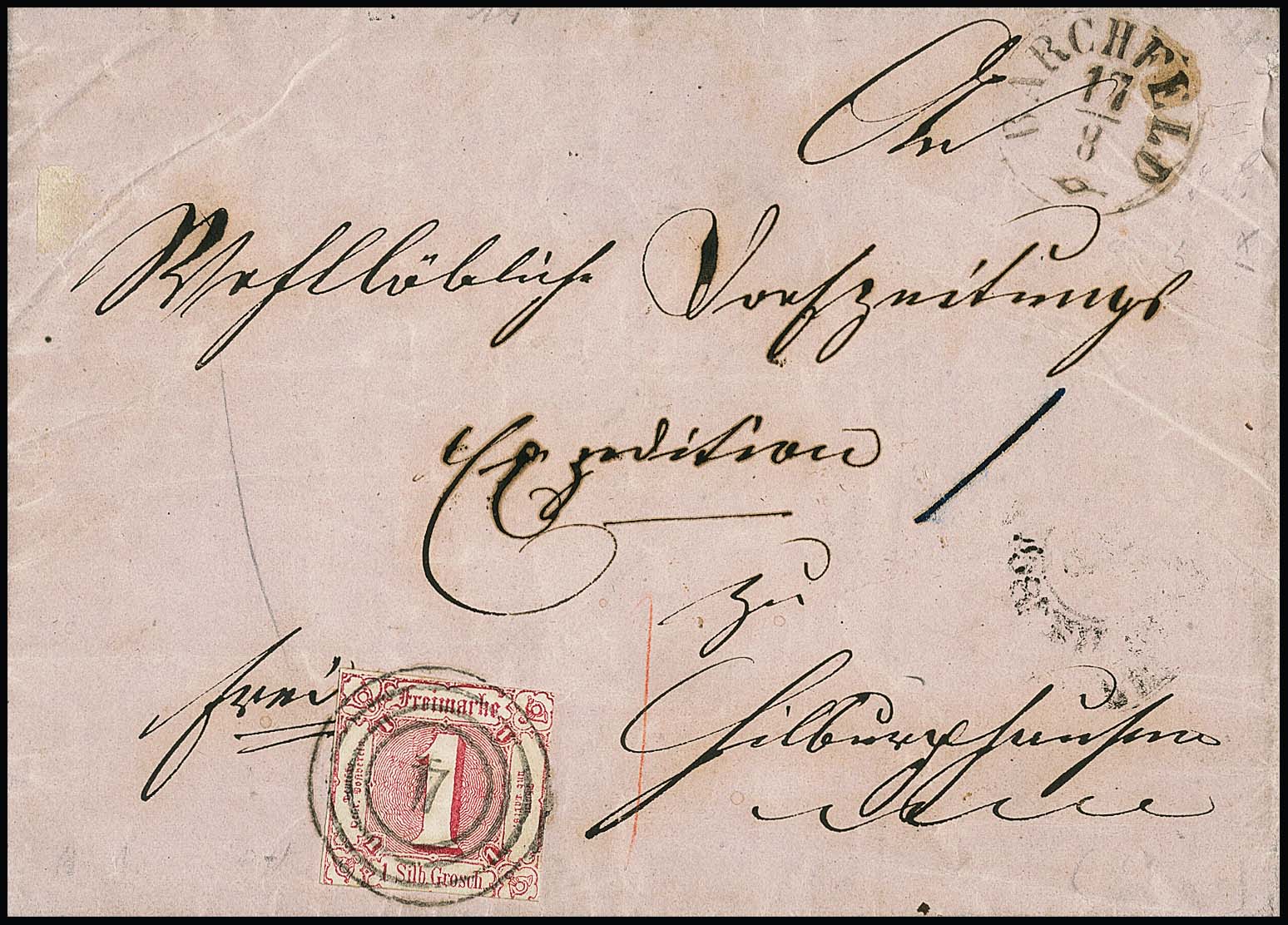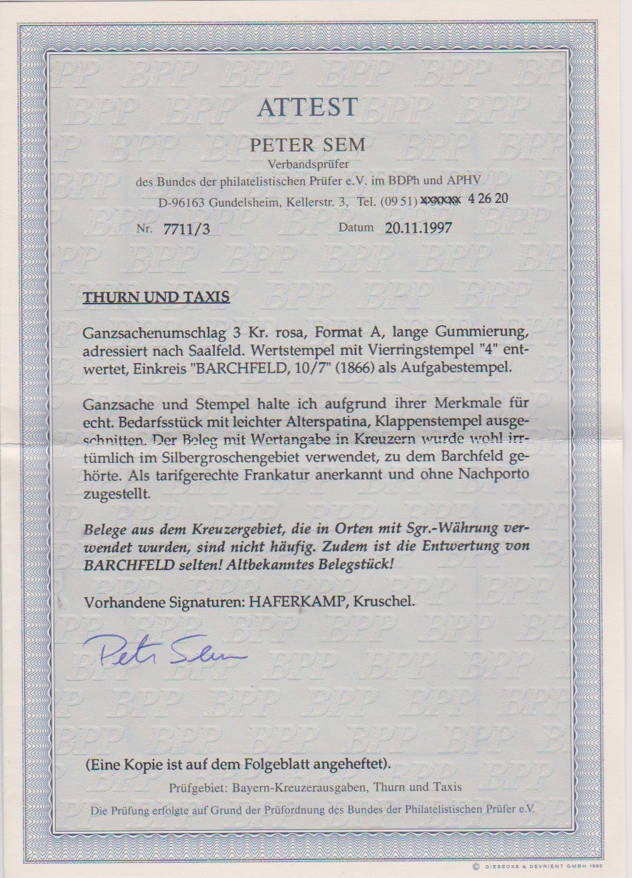 "4" nebst K1 "Barchfeld" klar auf Ganzsache 3 Kr. rosa (leichte Patina und rs. Siegel ausgeschnitten). Das bekannte Stück ex Reitmeister und aus der berühmten Kruschel-Auktion 1972. Nummernstempelbriefe von Barchfeld (wiedereröffnet 1.8.1861) sind ohnehin nicht häufig. Hier jedoch statt eines Silbergroschen-Couverts währungswidrig eine Kreuzer-Ganzsache verwendet, in vorliegender Form wohl Unikat. Sign. Haferkamp, Kruschel und Attest Sem