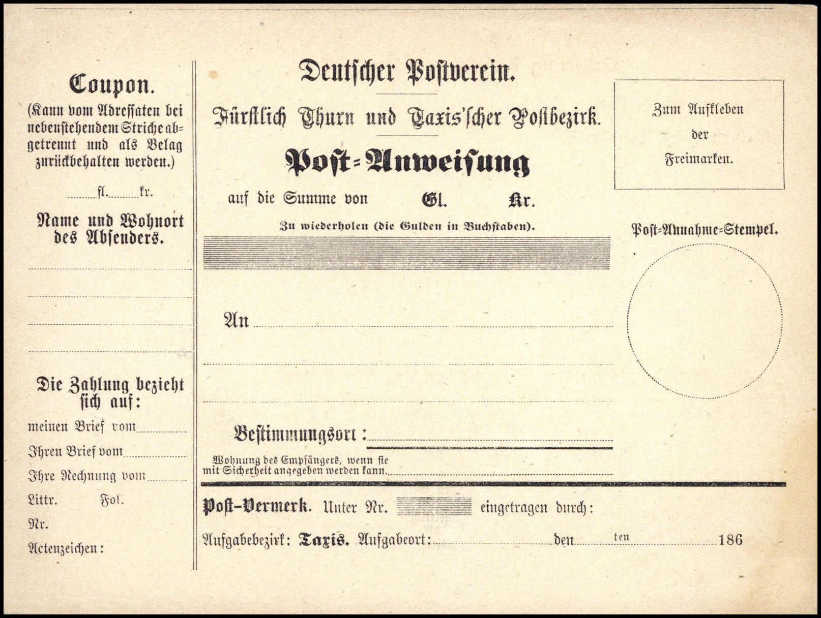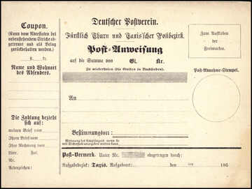 1867, nicht mehr zur Verwendung gekommenes, ungebrauchtes Postanweisungsformular mit Inschrift "Deutscher Postverein"