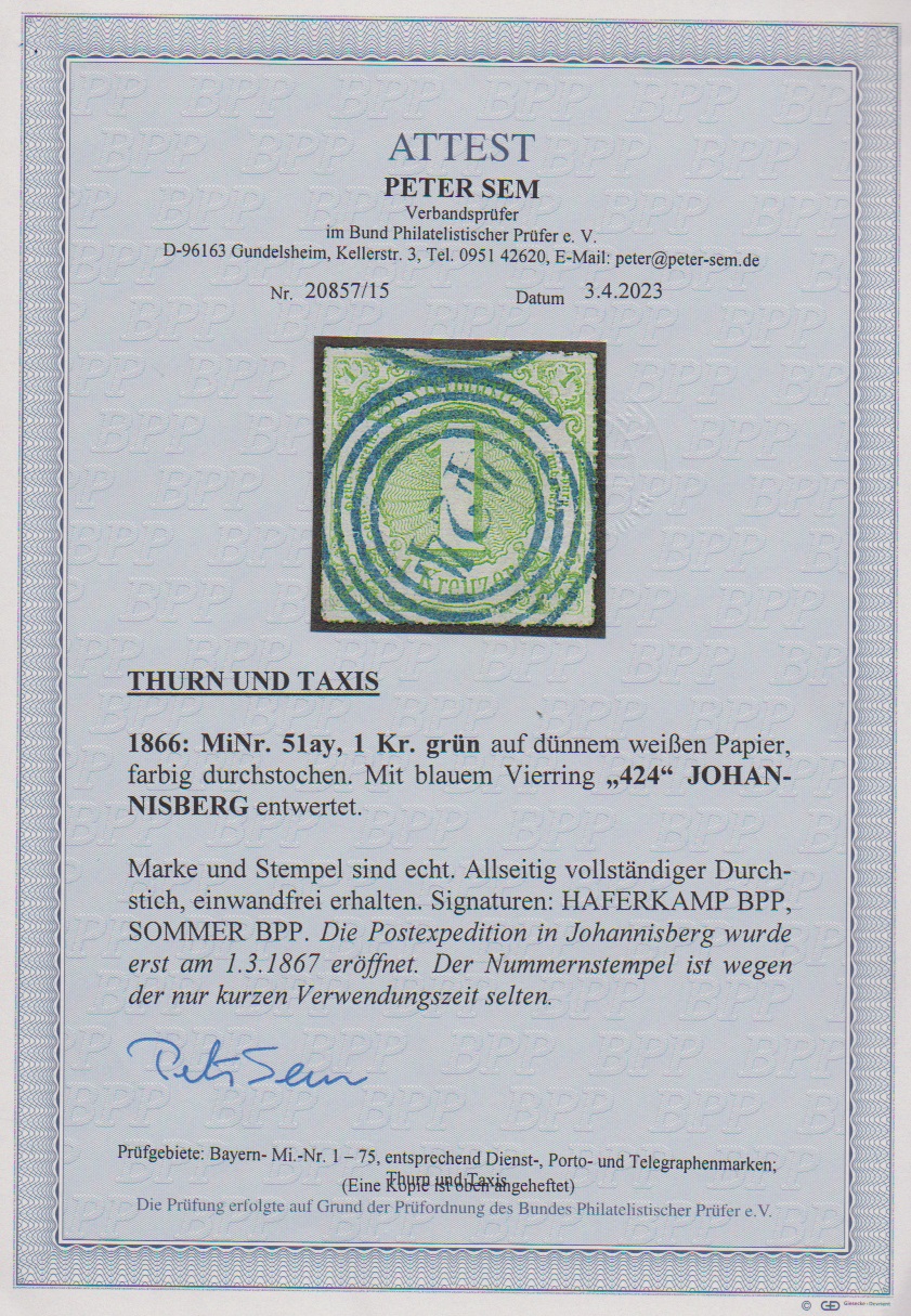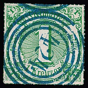 1 Kr. grün, dünnes Papier, Kabinettstück mit seltenem blauem NS "424" (Johannisberg), sign. Haferkamp, Sommer und Attest Sem, ex Slg. Erivan Haub