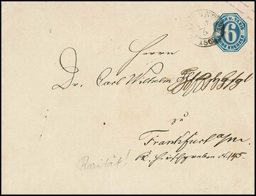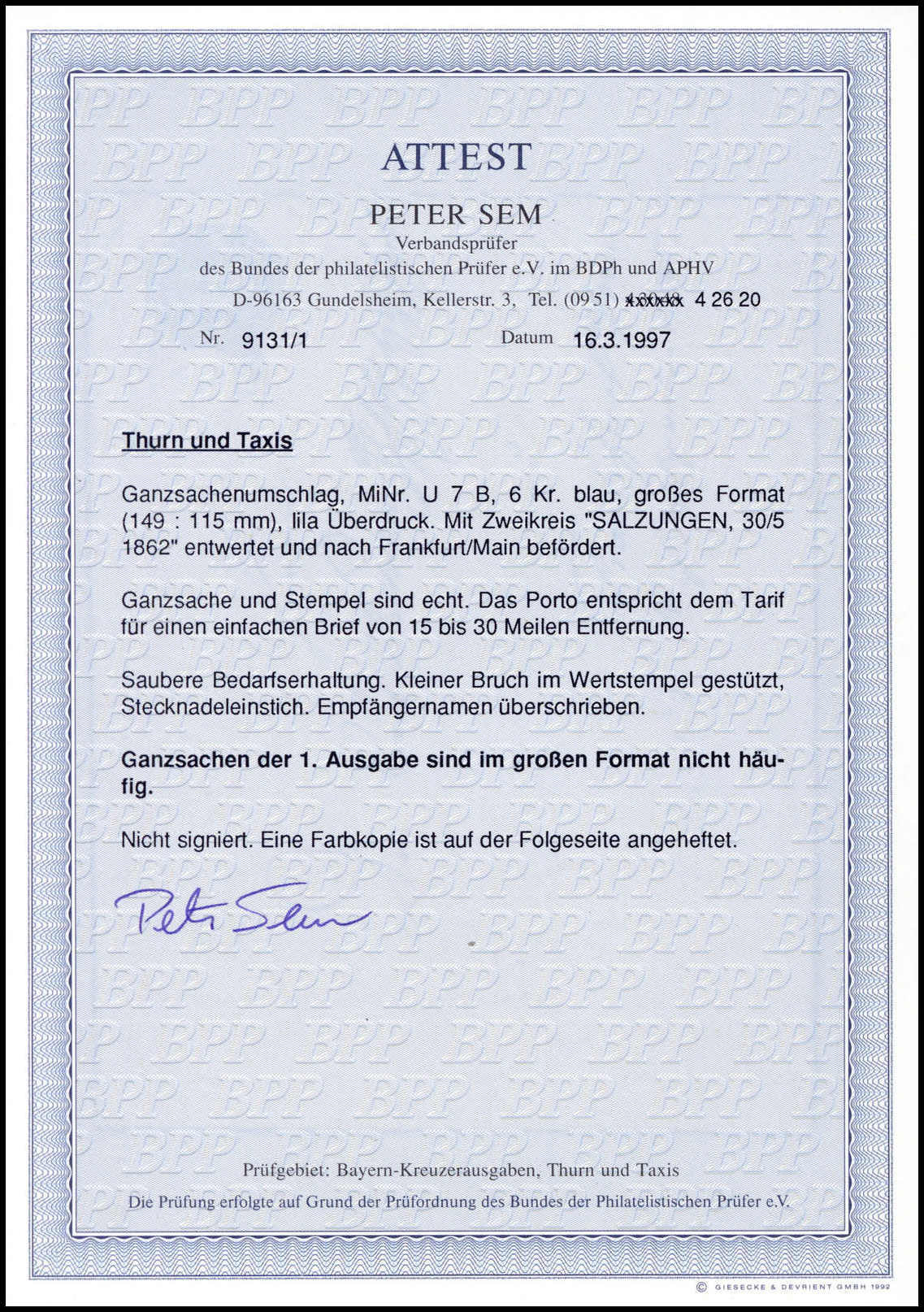 Ganzsache 6 Kr. blau im Großformat, frisch erhaltener Umschlag mit K2 "Salzungen", 30.5.1862, nach Frankfurt/M. (kl. Gebrauchsspuren wie kleiner Prägebruch), Fotoattest Sem. Mi. 600,-