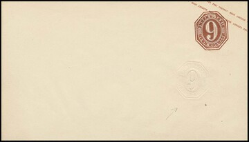 Ganzsache 9 Kr. braun, ungebrauchtes Kabinettcouvert mit deutlicher Doppelprägung des Wertstempels, einmal oben rechts schon in die Inschrift verschoben und zusätzlich deutlich darunter eine farblose zweite Prägung. Attest Richter