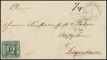 "3" nebst K1 "Amöneburg" klar auf Prachtbrief mit weitgehend vollrandiger 1/2 Sgr. schw./blaugrün, Fotoexp. Sem