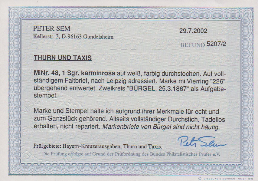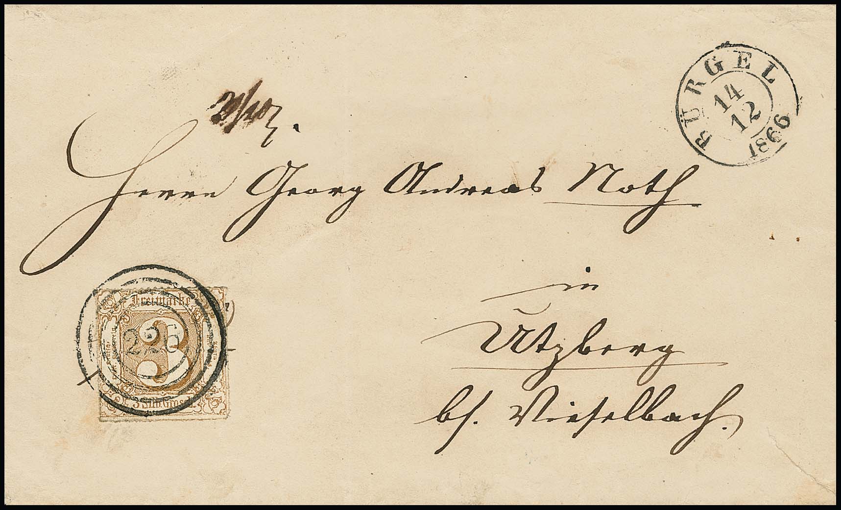 "226" nebst K2 "Bürgel" auf Prachtbrief 1 Sgr. rot (Fotoexp. Sem), sowie auf Couvert (leichte Gebrauchsspuren) mit 3 Sgr. (seltener Brief der 3. Gewichtsstufe nach Utzberg bei Vieselbach, rs. "6" Pfge. Landbestellgeld quittiert)