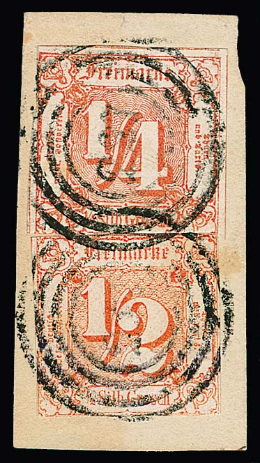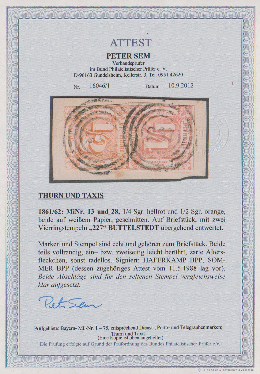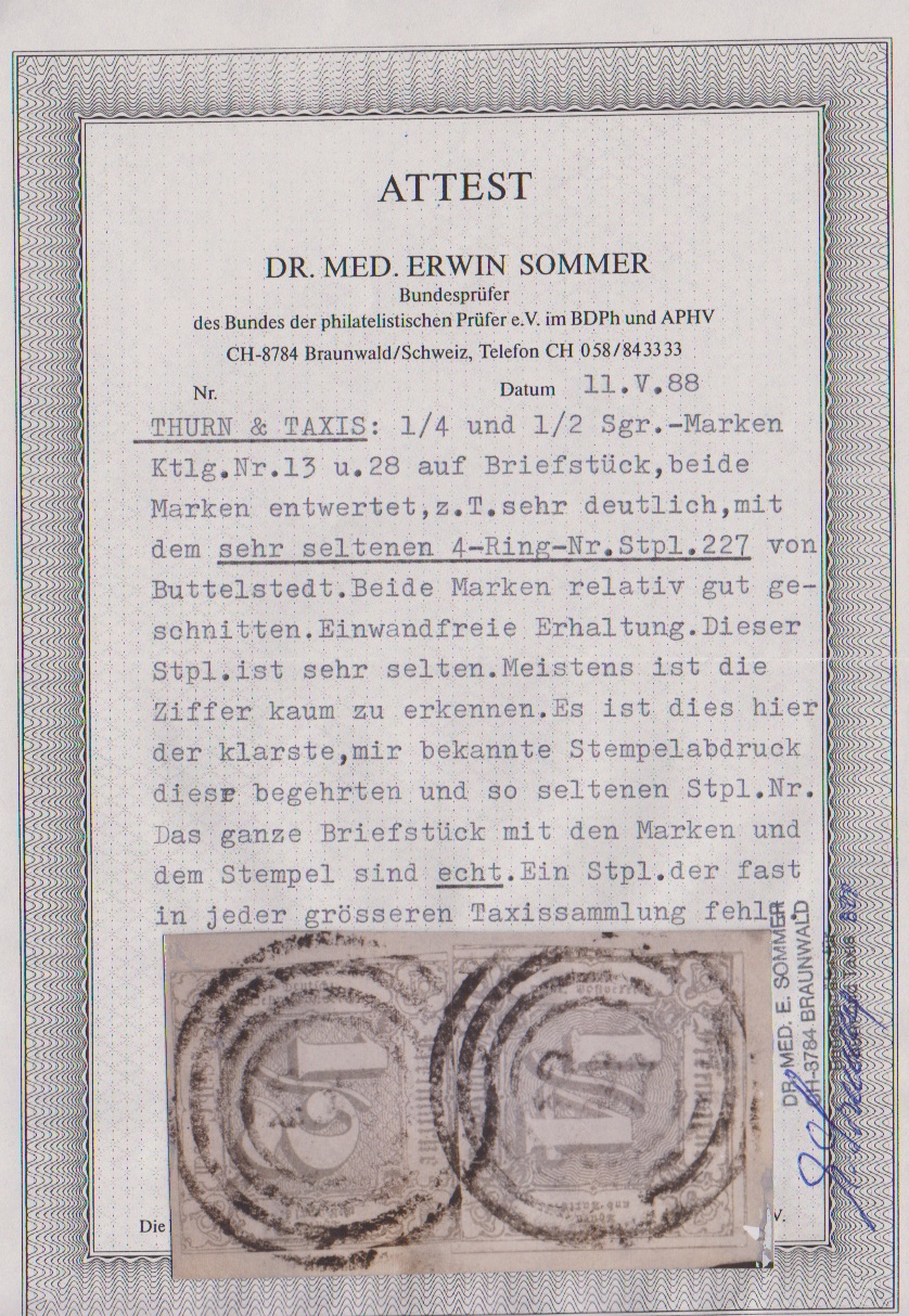 "227" (Buttelstedt), seltener NS klar auf Briefstück mit 1/4 und 1/2 Sgr. (Taxisschnitt), Atteste Sem, Sommer