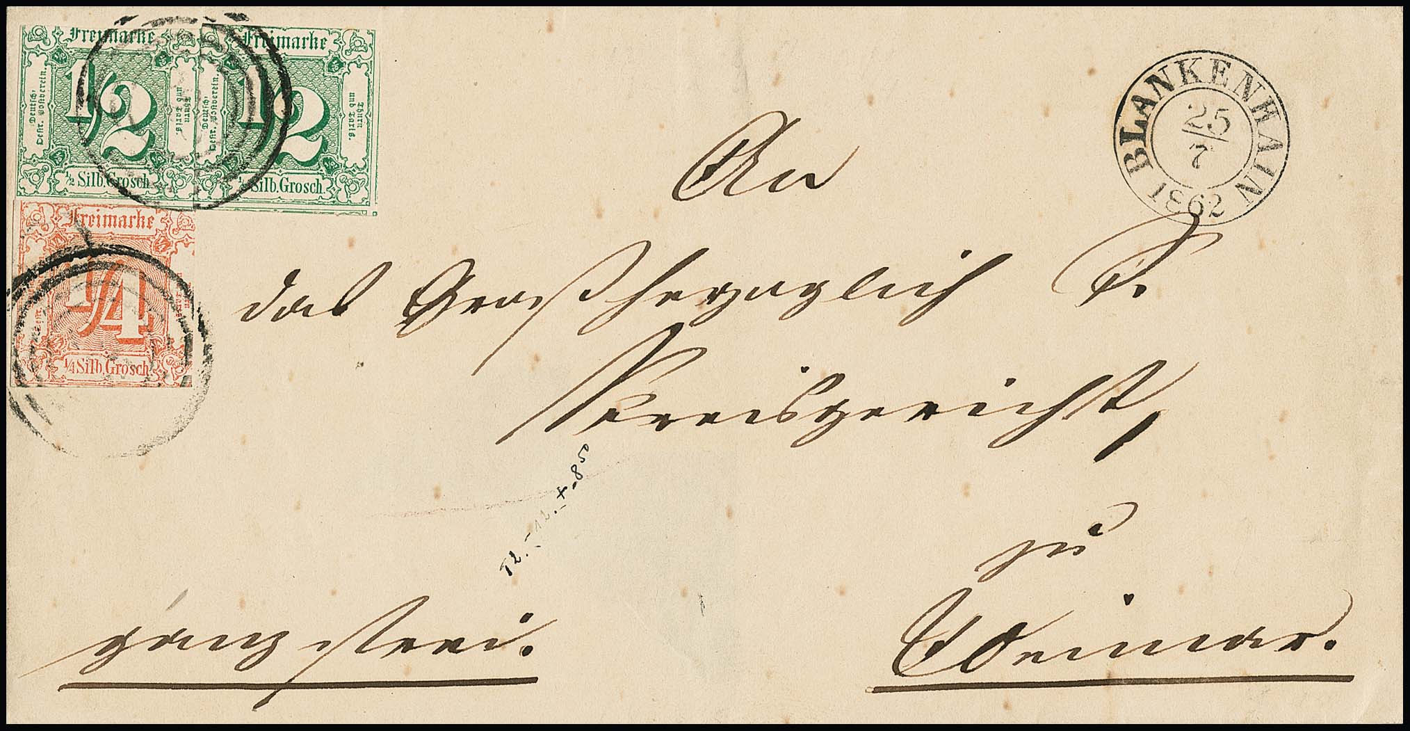 "225" zart nebst K2 "Blankenhain" 1862 auf Bestellgeldbrief mit üblich geschnittenen 1/4 Sgr. rotorange und zweimal 1/2 Sgr. grün