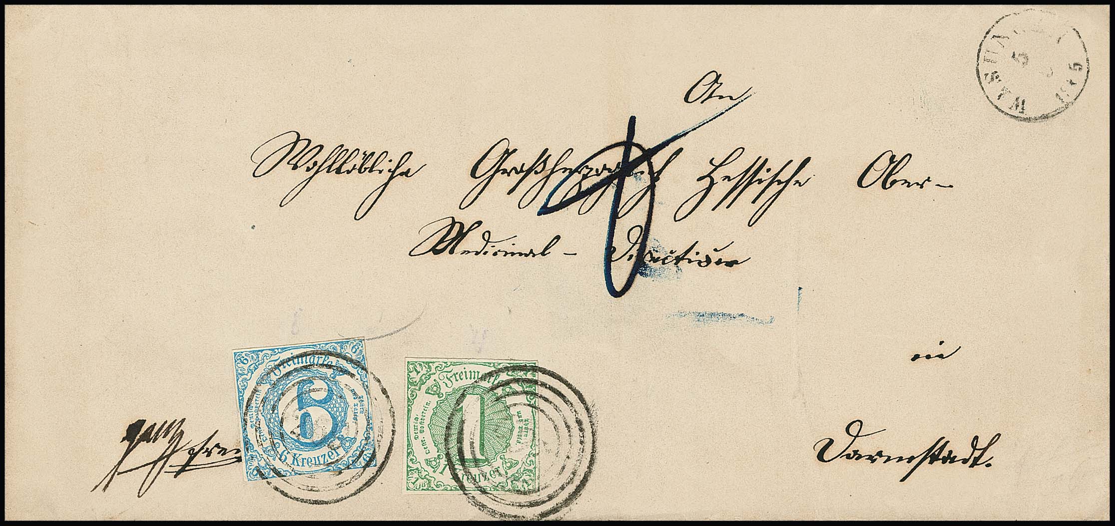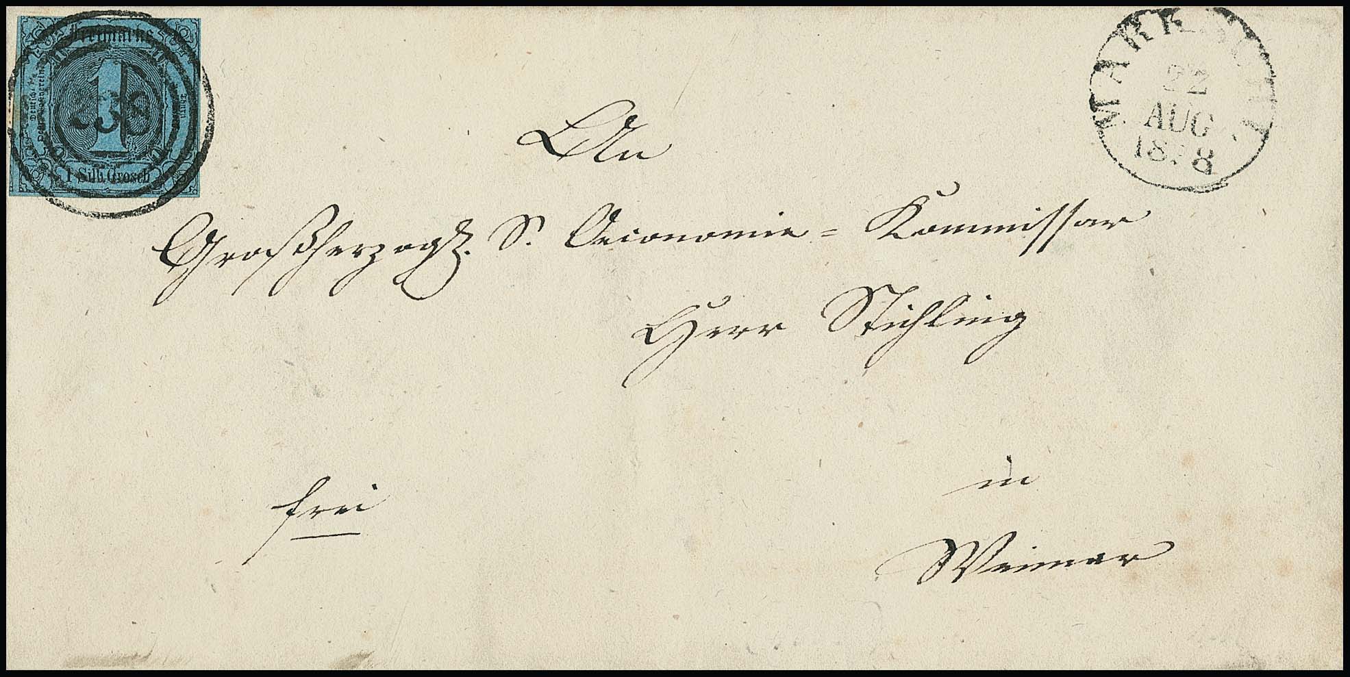 "243" nebst K2 "Stadtremda", je in seltener blauer Farbe, klar auf Brief mit breitrandiger 3 Sgr. schw./gelb (Bugspur), Fotoexp. Sem. Feuser + 1000,-