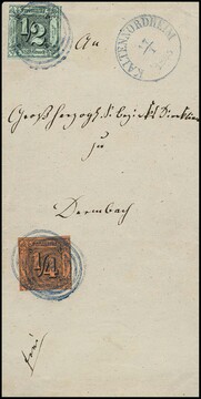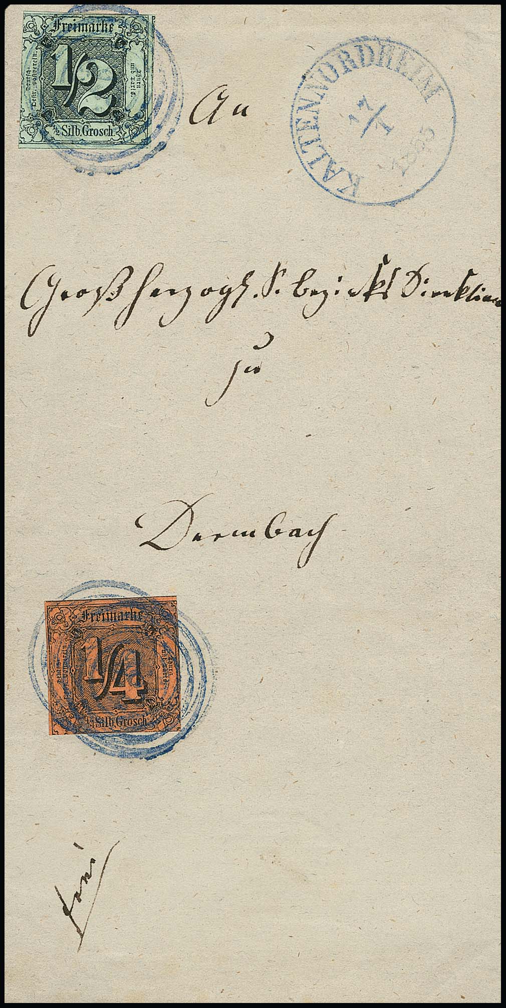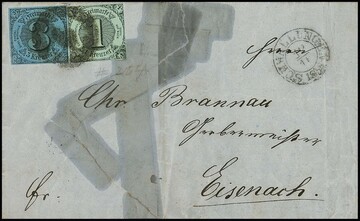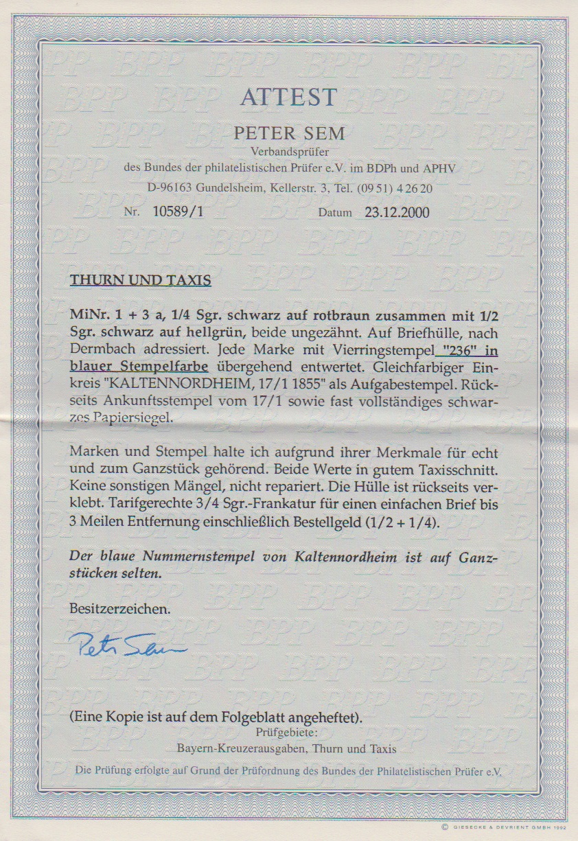 "236" nebst K1 "Kaltennordheim", jeweils in sehr seltener blauer Farbe, auf Brief mit 1/4 und 1/2 Sgr., Feuser + 1800,-, Attest Sem