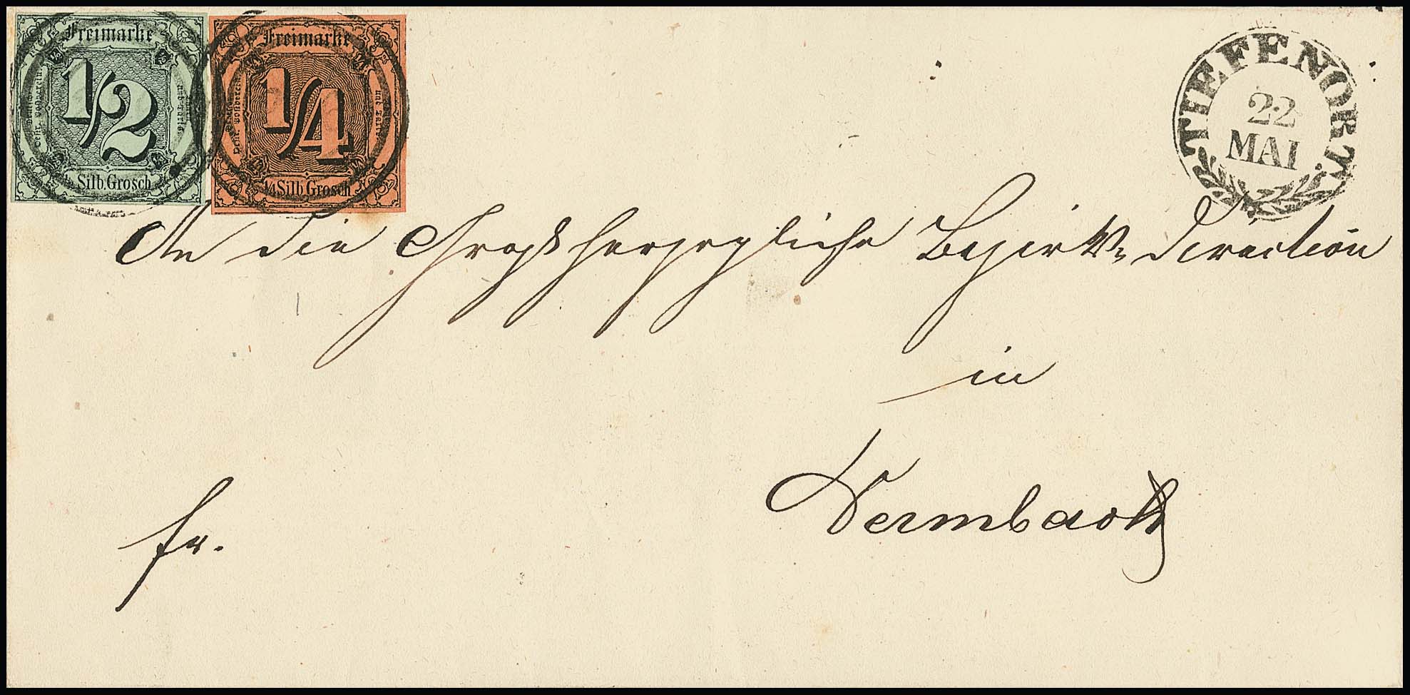 "233" (Geisa) sehr schön klar auf dekorativem Briefstück mit erste Ausgabe 1/4 Sgr. (nur oben links winzig ber.) und 1/2 Sgr. (vollrandig)