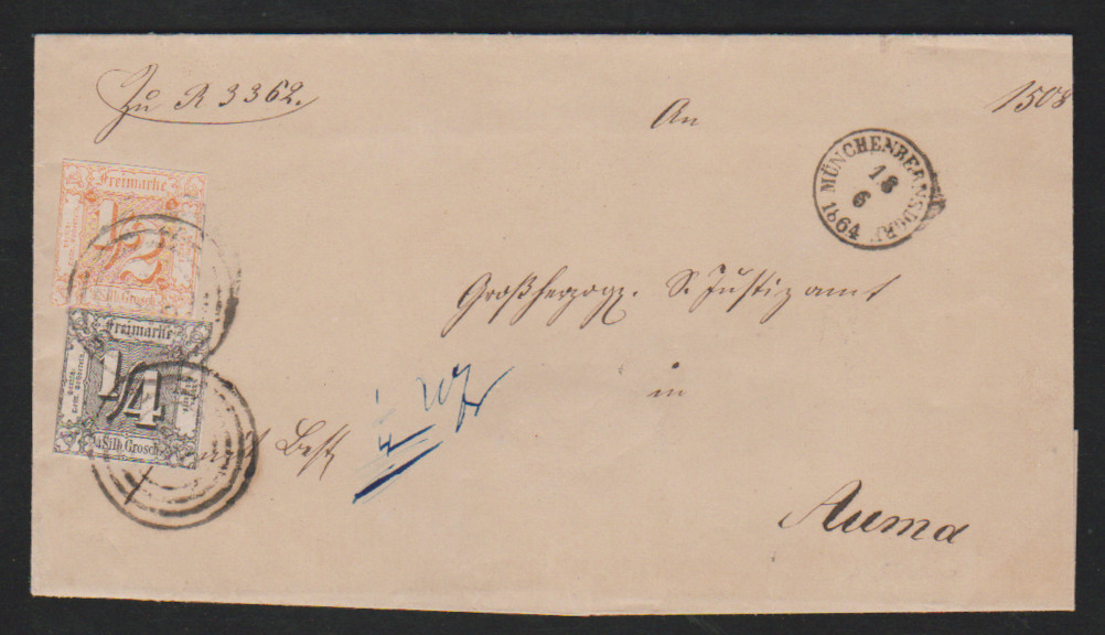 "239" nebst K1 "Münchenbernsdorf" auf Bestellgeldbrief mit 1/4 und 1/2 Sgr.