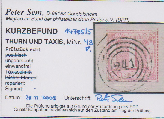 "241" (Ostheim) je sehr klar auf breitrandiger 1/2 Sgr. grün (kl. Mgl.) und auf Kabinettbriefstück 1 Sgr. rosa, je Fotoexp. Sem