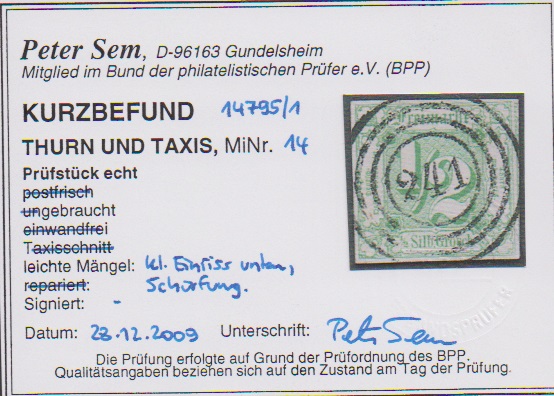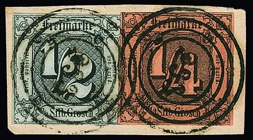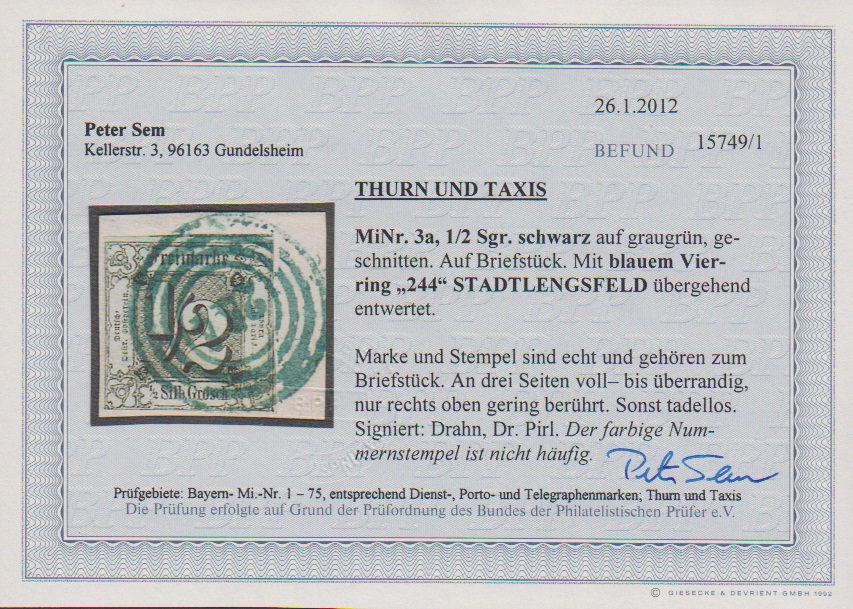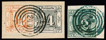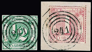 "244" (Stadtlengsfeld) in rot noch erkennbar auf 1/4 Sgr. schw./rotbraun (nur links oben leicht berührt), sowie sehr schön klar auf Briefstück 3 Sgr. schw./gelb (kleine Ausbesserung), sign. Sem bzw. für Nr. 6a tadelloses Attest Sommer. Sehr seltene Abstempelungen!