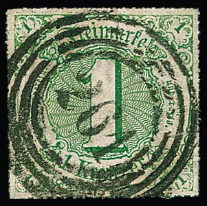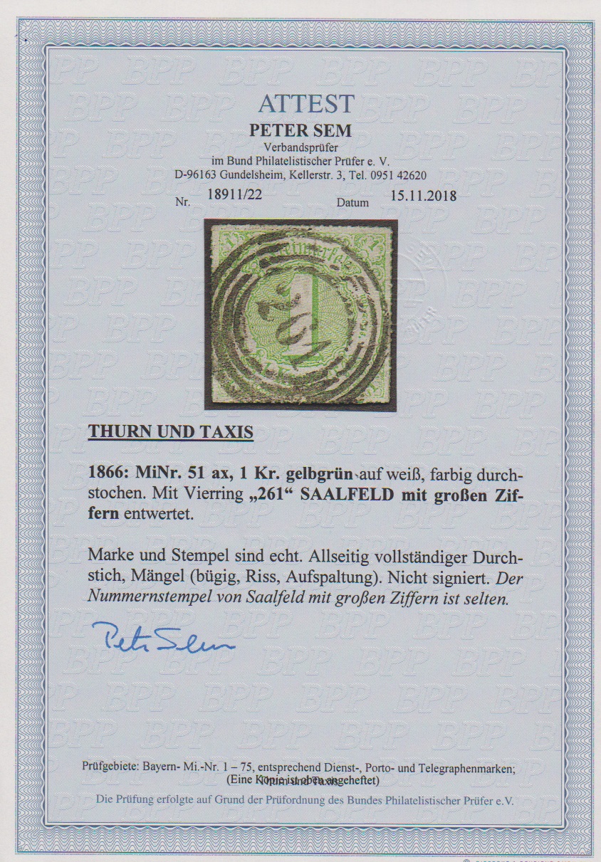 "261" (Saalfeld), guter NS mit großen Ziffern klar auf 1 Kr. grün (Mgl.), Attest Sem, ex Slg. Erivan Haub