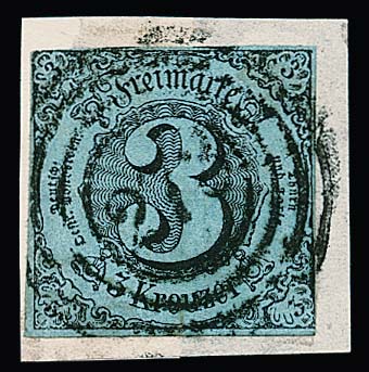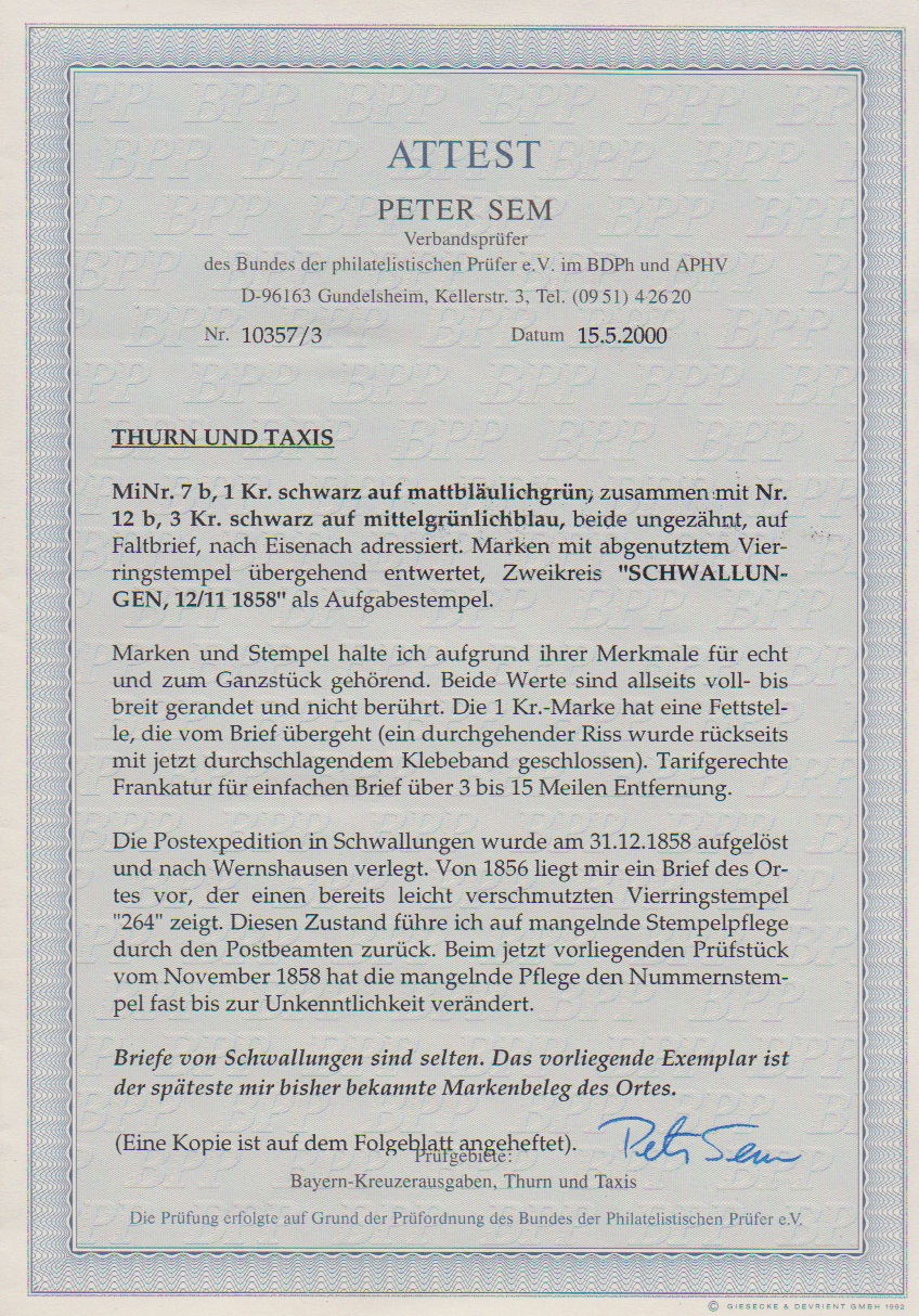 "264" typisch verschmutzt, nebst K2 "Schwallungen", auf Brief mit 1 und 3 Kr. Briefpapier mit fettigem Klebestreifen geschlossen, dadurch auch die rechte untere Ecke der 1 Kr. Fettspuren, dennoch ein sehr seltener Nummernstempelbrief dieses Ortes in der 1. Verteilung (geöffnet bis 31.12.1858, hier aus Nov. `58 in der bisher spätest bekannten Verwendung dieses Nummernstempels im ungepflegten Spätzustand). Es dürften nur eine handvoll Nummernstempelbriefe dieses Ortes existieren. Feuser + 3000,-, Attest Sem