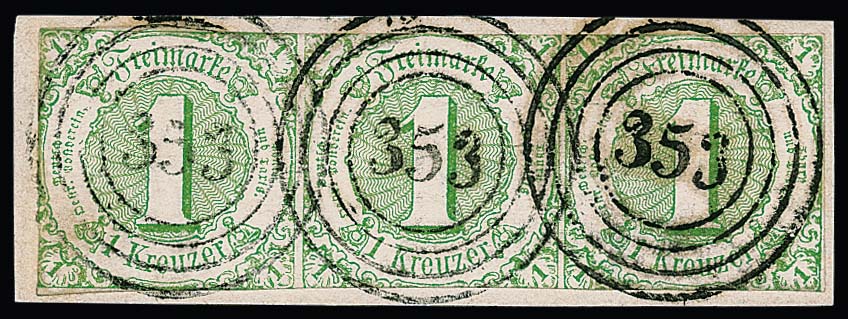 "353" (Sonnefeld) klar auf hübschem Briefstück mit üblich geschnittenem Dreierstreifen 1 Kr. grün
