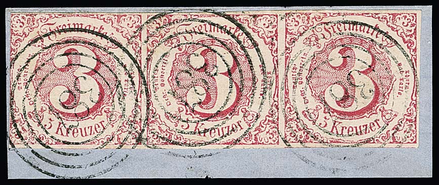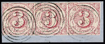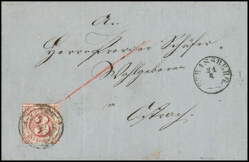 "387" (Neuhaus am Rennweg) klar auf Kabinettbriefstück mit teils sehr breitrandigem Dreierstreifen 3 Kr. rot, sign. Sem