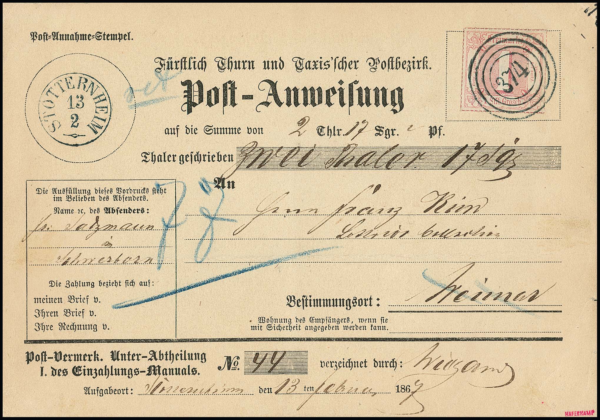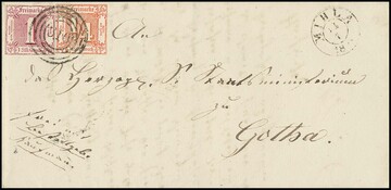 "374" nebst K1 "Stotternheim", je in dunkelblau, auf Postanweisung (übliche leichte Faltspur) mit Kabinettstück 1 Sgr., sign. Haferkamp