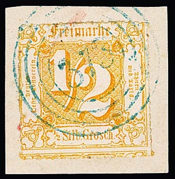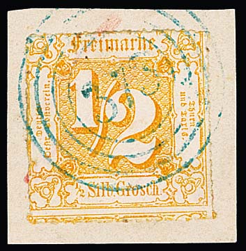 "373" (Grossrudestedt) in blau auf Kabinettbriefstück 1/2 Sgr. orange, Fotoexp. Sem