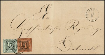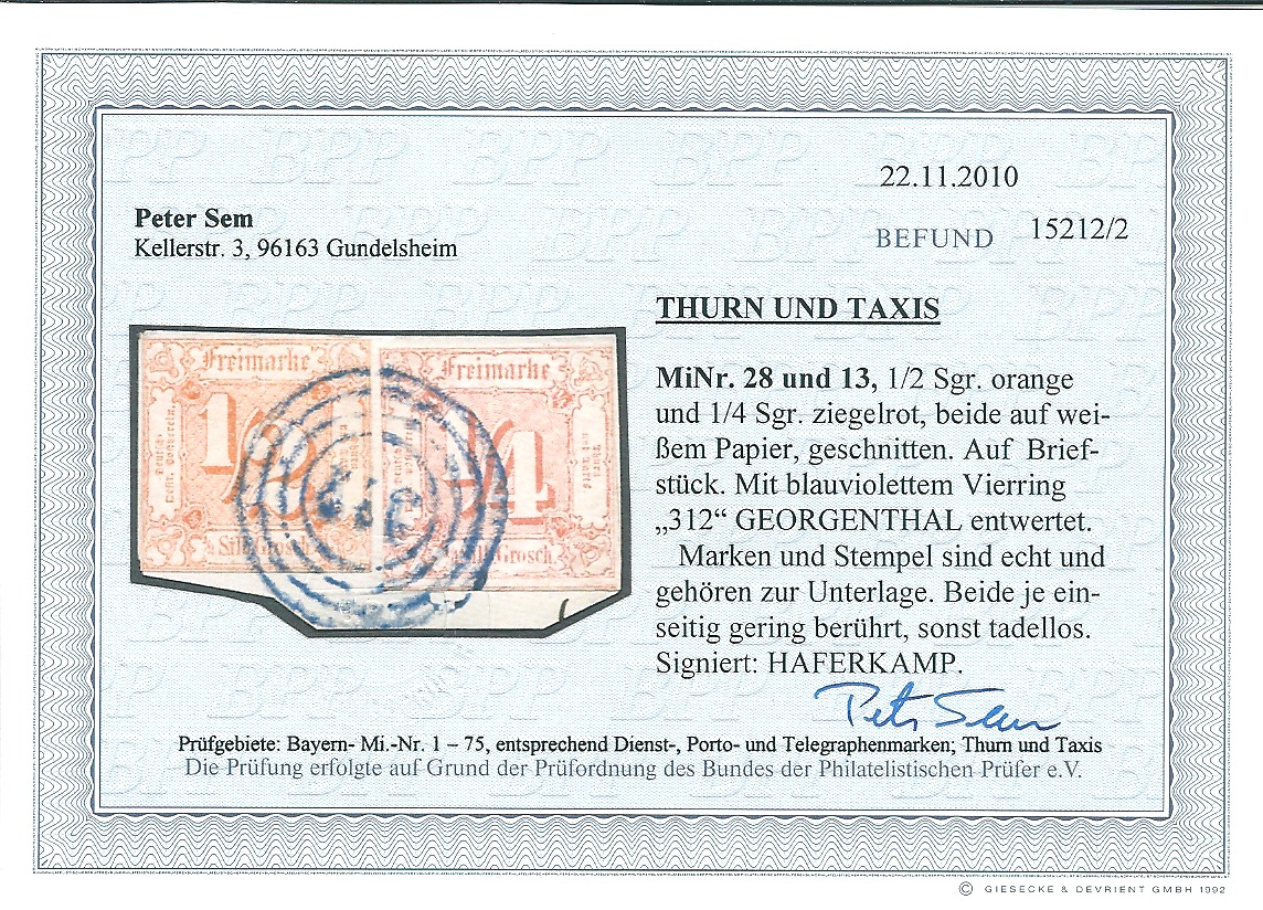 "312" (Georgenthal) in blau auf hübschem Briefstück mit nur einseitig etwas berührten 1/4 Sgr. ziegelrot und 1/2 Sgr. orange, Fotoexp. Sem