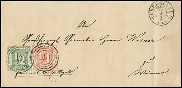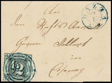 "313" nebst K2 "Nazza", je in blau, auf kleinem Briefchen mit 1/2 Sgr., normal geschnitten, 1860 nach Eisenach