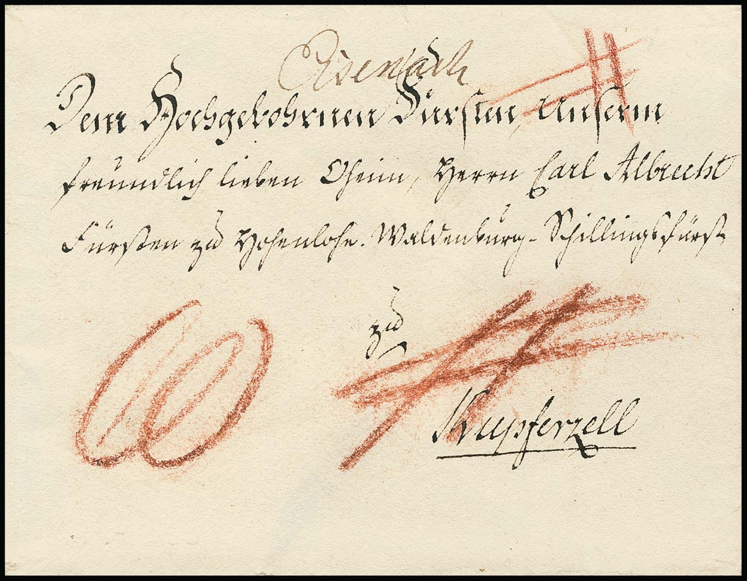 "Eisenach", (1780), handschriftliche Aufgabe auf dekor. Adelscouvert an den Fürsten zu Hohenlohe in Kupferzell
