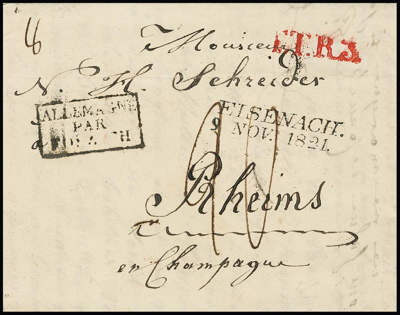"Eisenach", 1821/34, je Schrägschrift-L2 auf zwei Auslandsbriefen nach Rheims/Frankreich, versch. Taxen