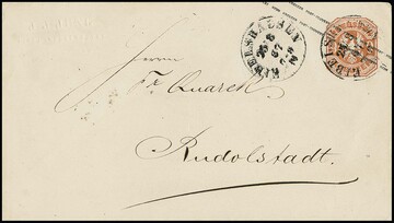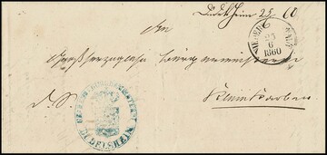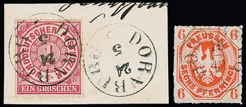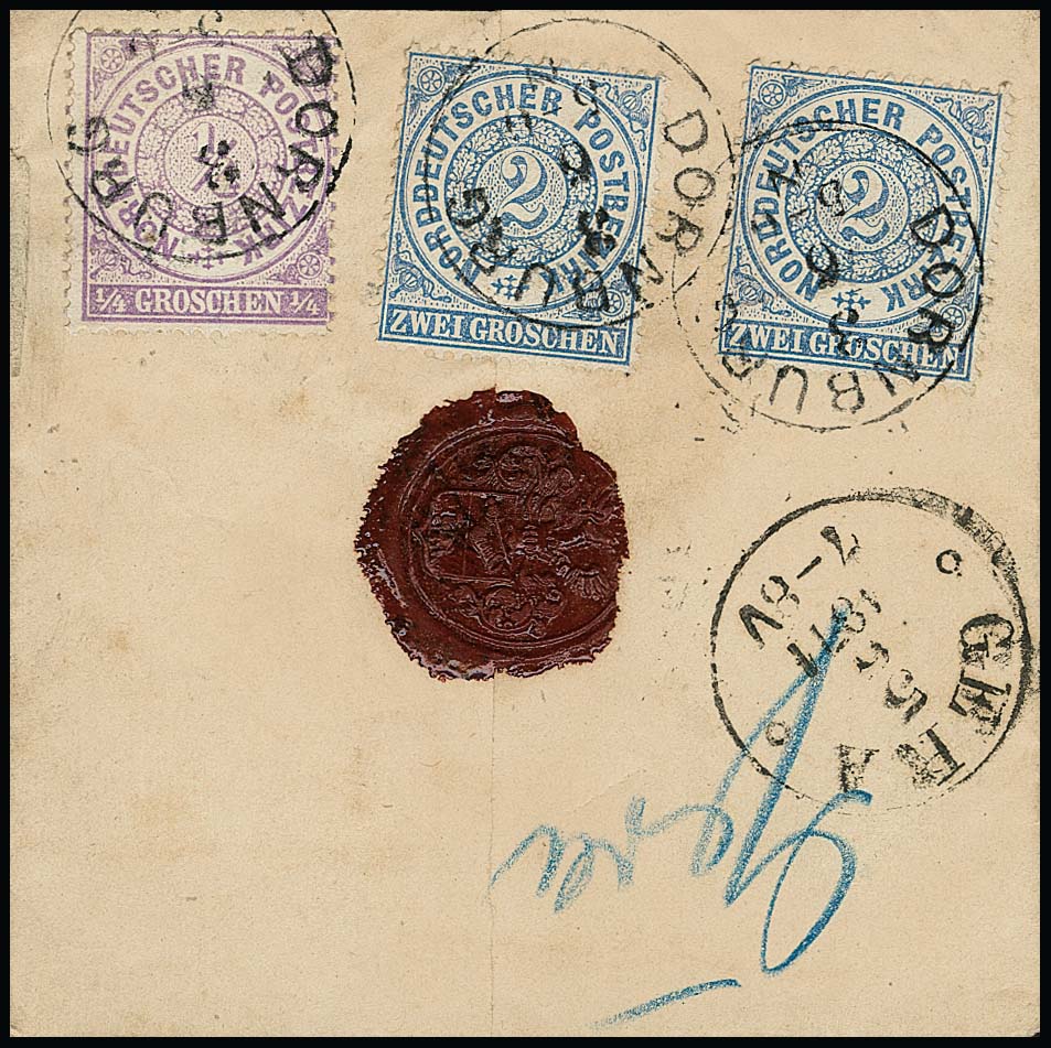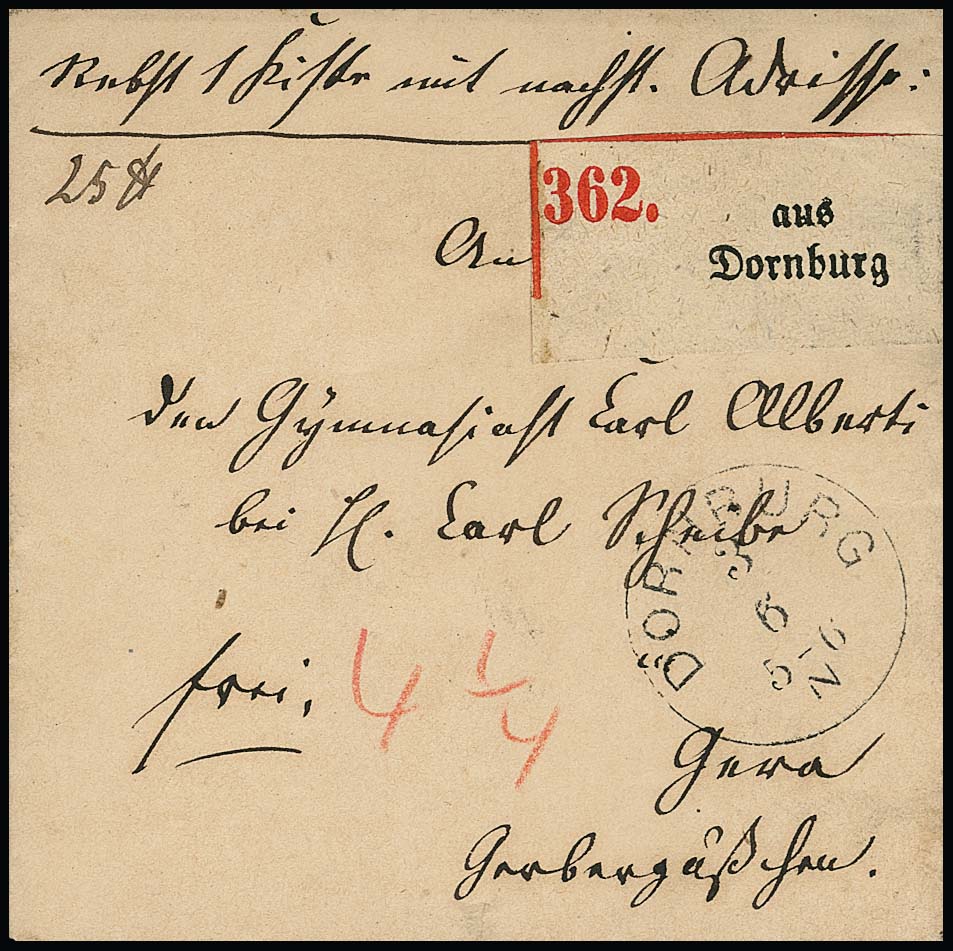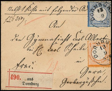 "Dornburg", besserer nachverw. K1 klar auf zwei ungewöhnlich kleinformatigen Paketbegleitbriefen aus gleicher Korrespondenz an einen Gymnasiasten in Gera, mit NDP 1/4 Gr. violett und zweimal 2 Gr. blau rs., sowie großes Brustschild 1/2 Gr. orange und 2 Gr. blau (diese unauffällige Eckrep.) vs., ungewöhnliches Paar von einem seltenen Postort!