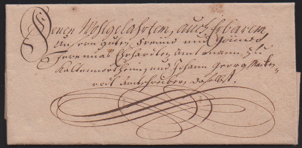 "Eisenach", 1721/1735, zwei dekorativ adressierte Schnörkelbriefe nach Kaltennordheim bzw. Cassel