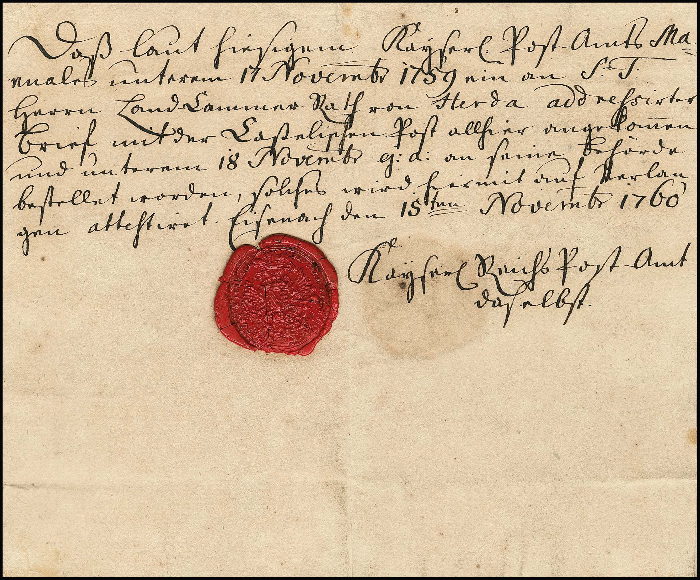 "Eisenach", 1760, dekor. großformatige handschriftliche Bescheinigung "kayserl. Reichs Post-Amt daselbst" über die Ankunft und richtige Bestellung eines Briefes (seltener Vorläufer einer Recepisse), zusätzlich ungewöhnlich großes rotes Lacksiegel der Reichspost