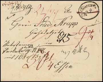 "Eisenach No.", 1831/38, Ovalstempel der Fahrpost mit hs. Nummer auf zwei Paketbriefen (einer typische Falten), u.a. an Krupp/Essen (Absender war die Eisenacher Münze)