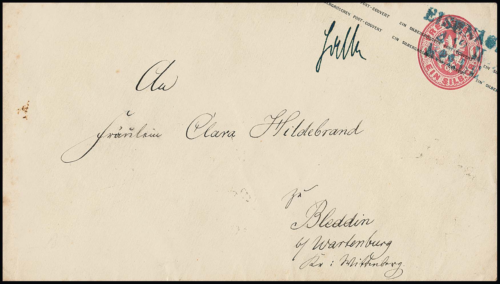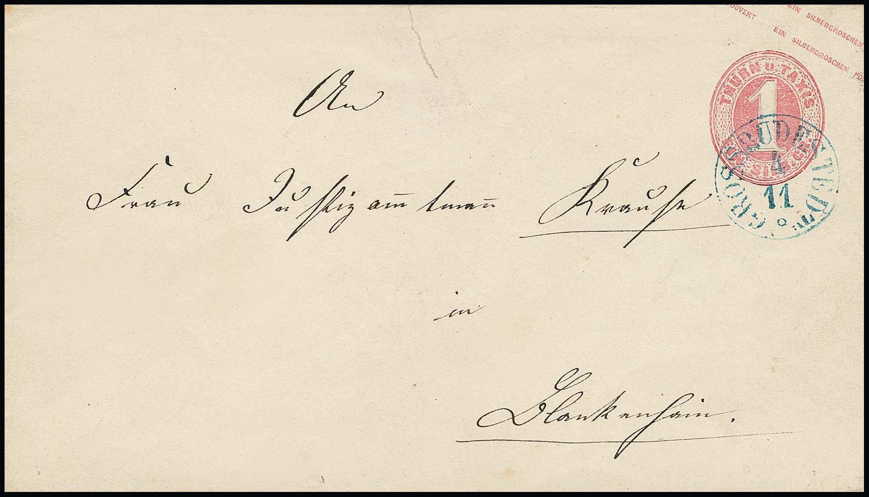 "Grossrudestedt", guter blauer K1 klar als Entwertung auf Ganzsache 1 Sgr. (kl. Randrißchen)